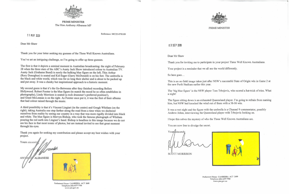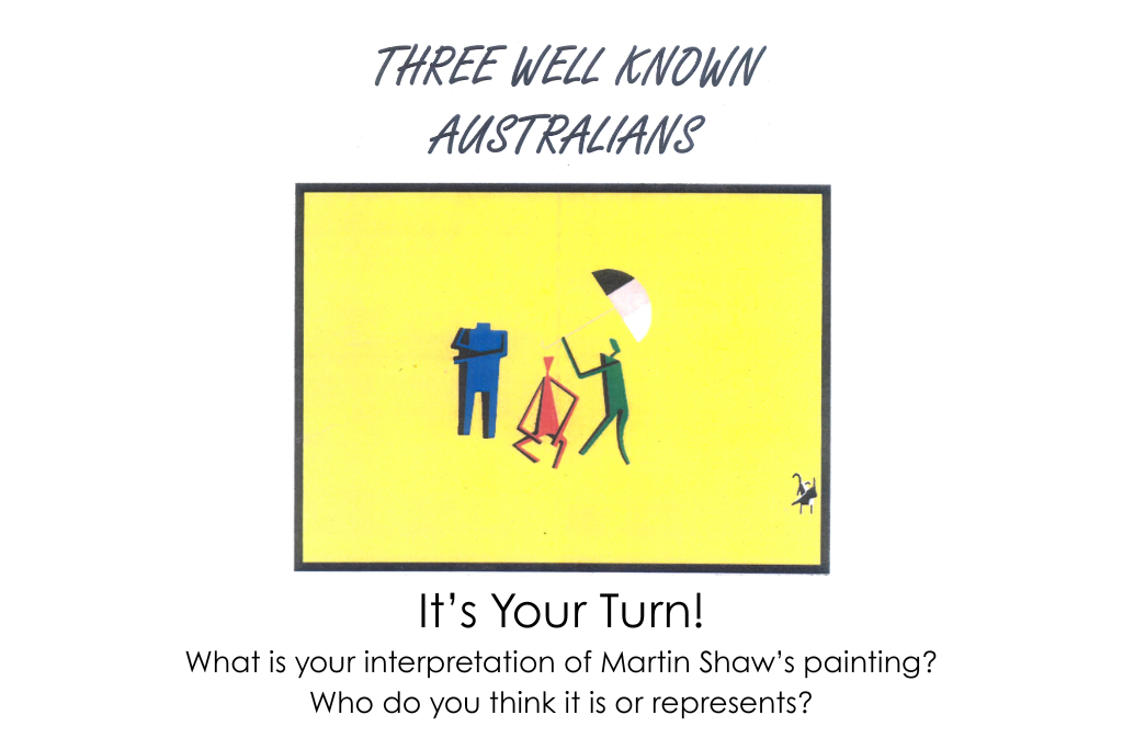 Who are the 'Three Australians' in the Painting? - The clues are in the painting. Martin Shaw won't reveal the answer. The 'Three Australians' has a bigger field to choose from than any Melbourne Cup Race. What can be revealed though, is 'Pea', the black and white dog is sitting in the corner. Sadly, Pea died in May 1991.
